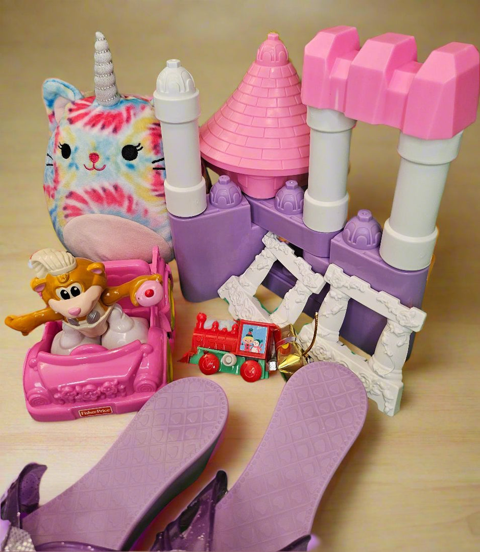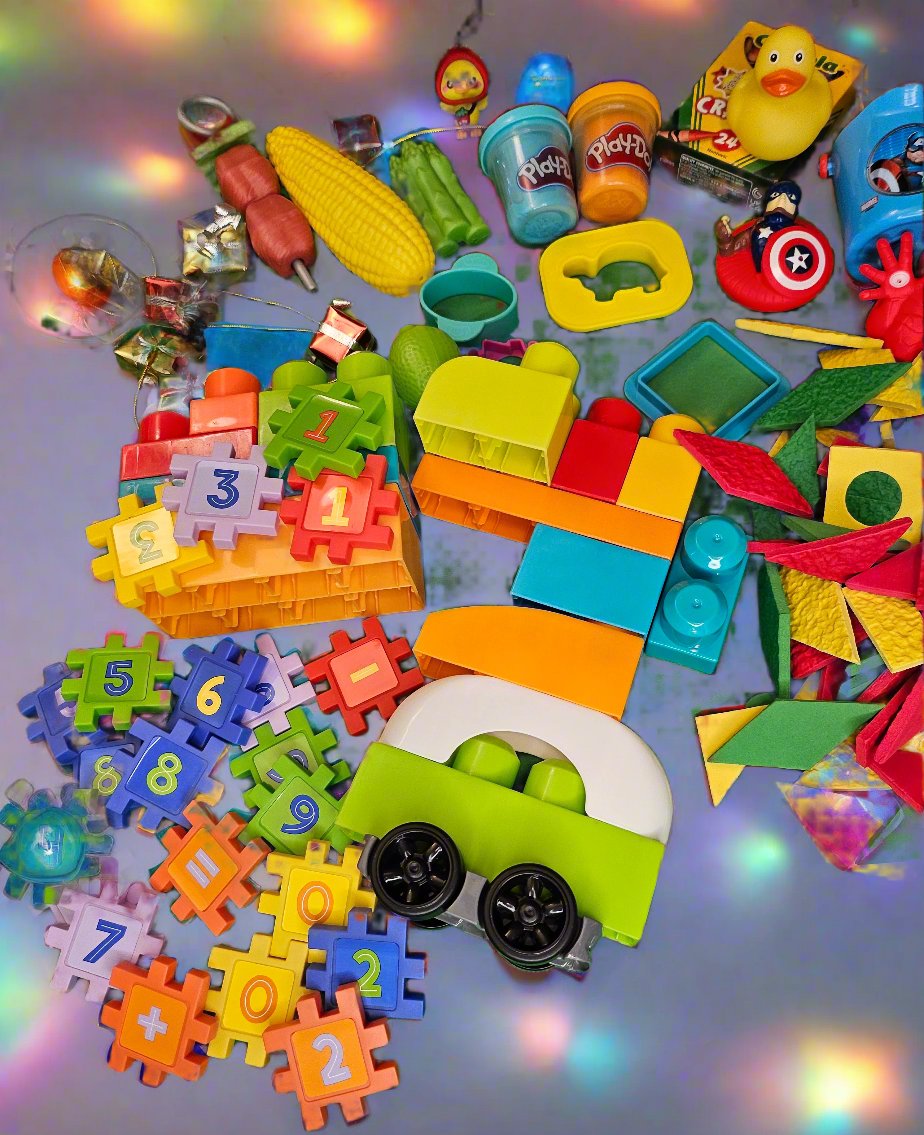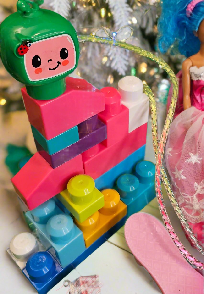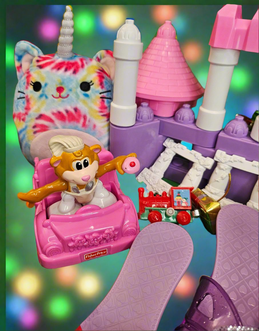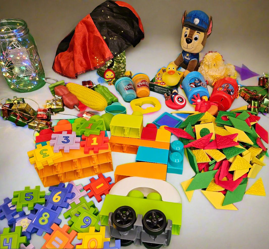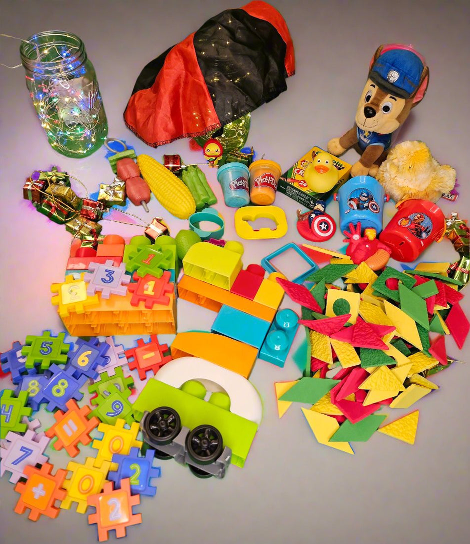 Preschool stockings include age-appropriate building blocks, two stuffies, books, crayons & playdoh, figurines and accessories. Santa's Gift believes in creating magical holiday moments without breaking the bank. Our pre-loved toys are carefully chosen and cleaned for a high-quality, joyful experience. Join us in making this season magical for your family—and the planet!