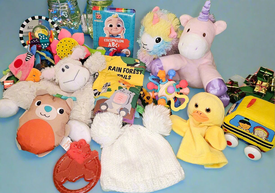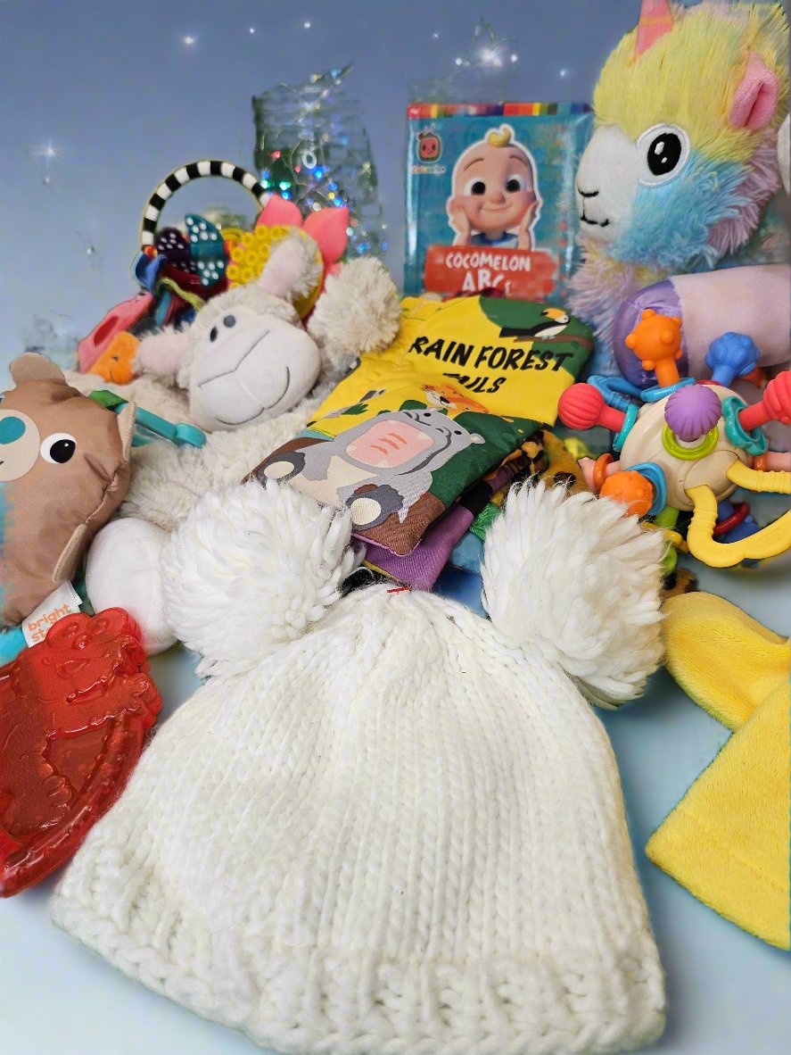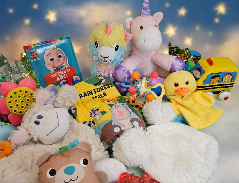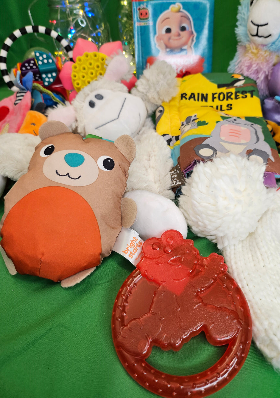 Infant stockings include teething toys, two stuffies, baby books and rattles. Santa's Gift believes in creating magical holiday moments without breaking the bank. Our pre-loved toys are carefully chosen and cleaned for a high-quality, joyful experience. Join us in making this season magical for your family—and the planet!