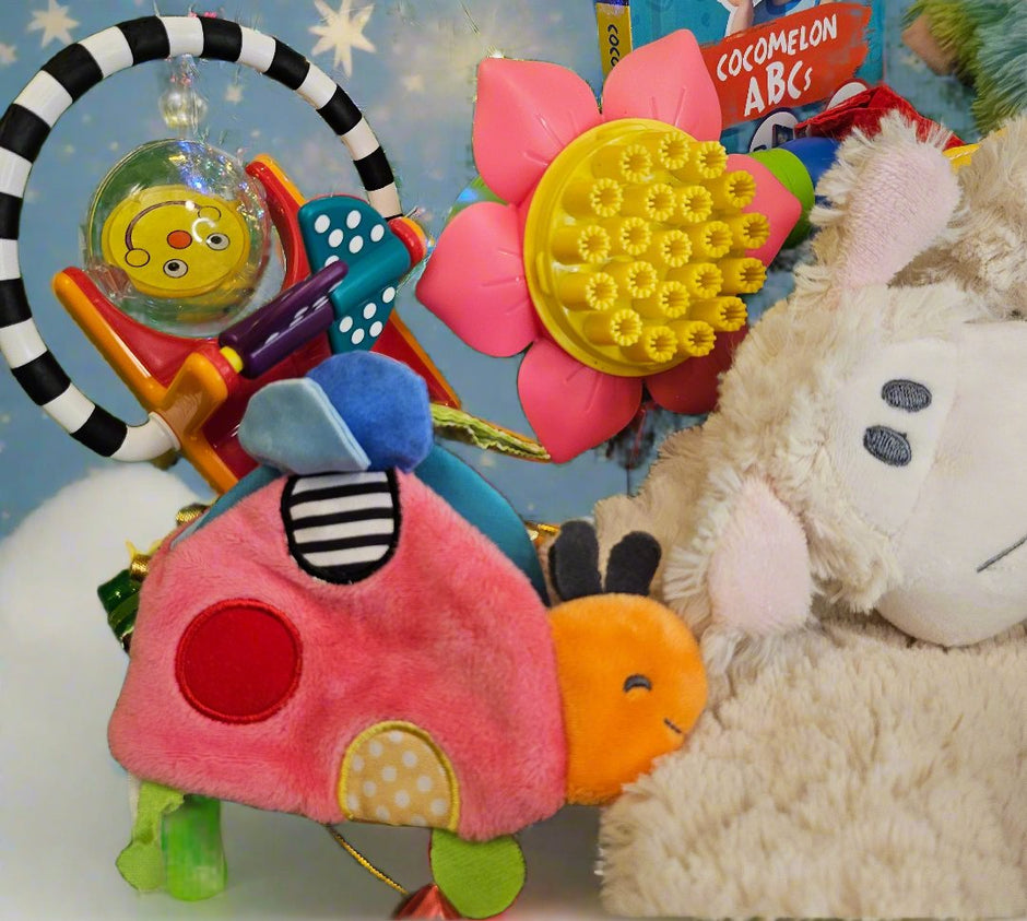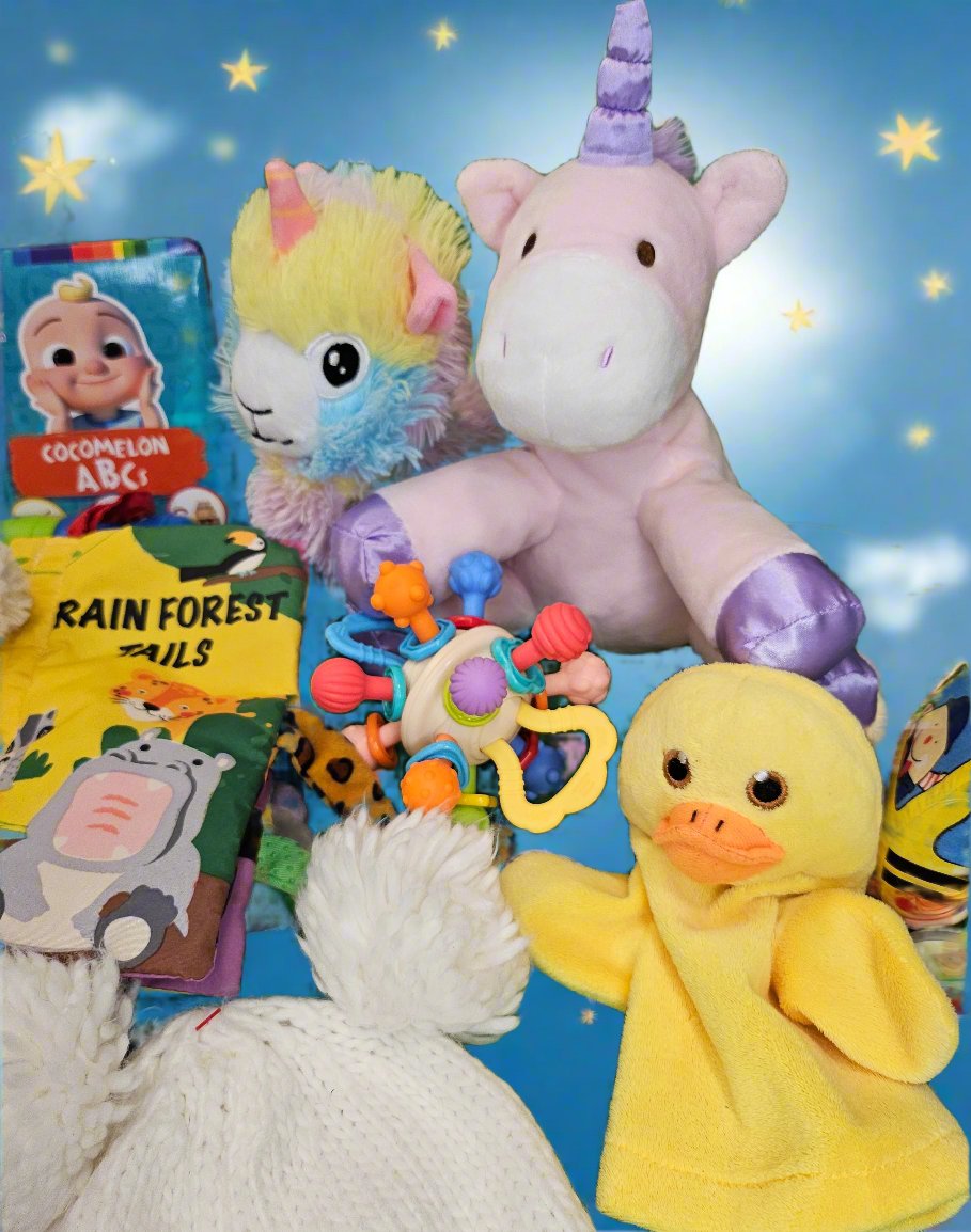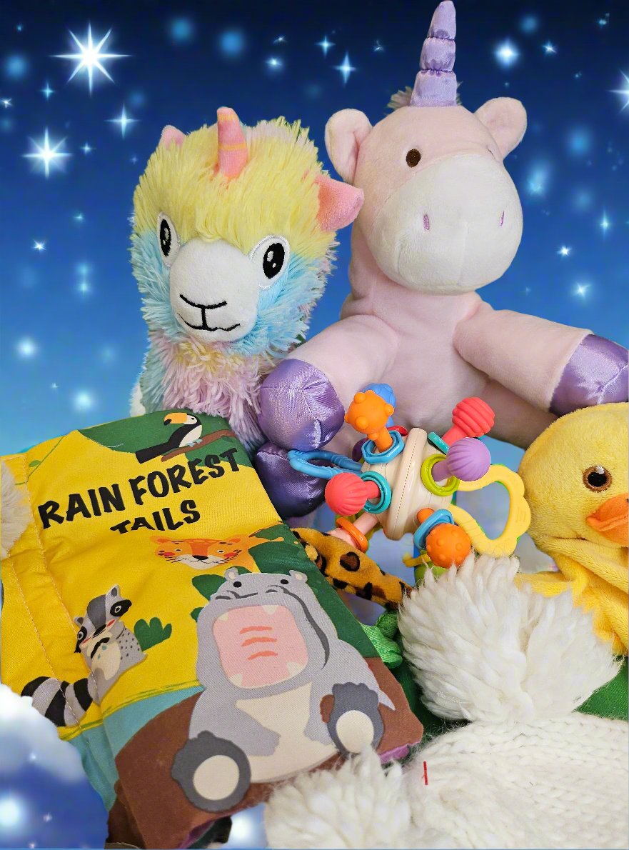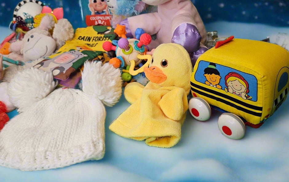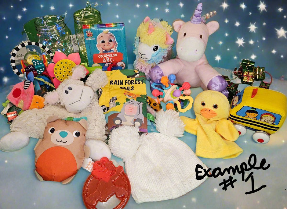Infant stockings include teething toys, two stuffies, baby books and rattles. Santa's Gift believes in creating magical holiday moments without breaking the bank. Our pre-loved toys are carefully chosen and cleaned for a high-quality, joyful experience. Join us in making this season magical for your family—and the planet!